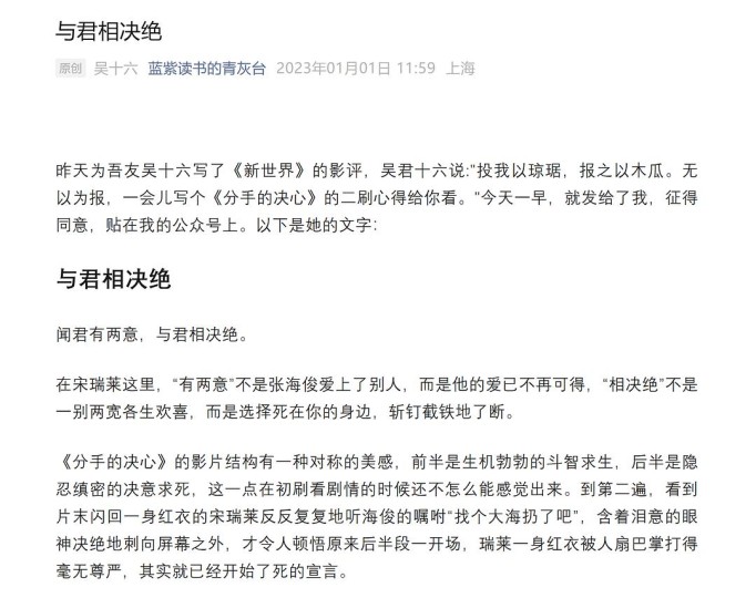 2023年元旦,吾友十六为《分手的决心》写的影评