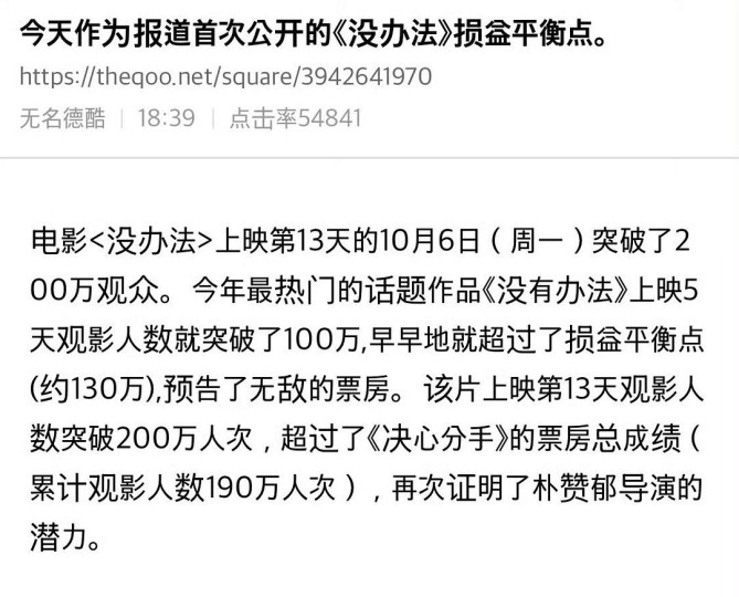10月6号,《无可奈何》在上映13天后观影人次超过200万名,发行公司CJ官博发了认证视频: