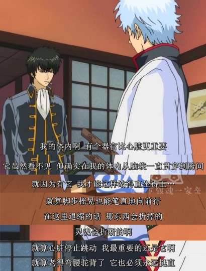 但在这死鱼眼不靠谱的废柴大叔外表下,却隐藏着一个真正的武士之“魂”。在第27集,银时执意拯救一群孤儿——他们被鬼道丸所养活,后者为了抚养他们甘愿沦为被权贵阶层豢养的地下格斗者,甚至付出生命保护他们。面对真选组副长土方因担心太危险的阻拦,他说出了那段著名的台词: “有个器官比我的心脏还重要,虽然我看不见它,但是它确实在我的体内,因为有它我才能站得直,就算步履蹒跚也能笔直往前走。如果我不去的话,它可是会拦腰折断的,我的灵魂它会拦腰折断的。比起心脏停止跳动,我更重视它。”